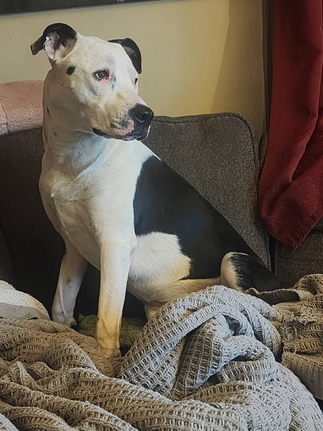 **Courtesy Post Only. NOT in our care** Chloe's owner passed away and is she finds herself in need of a new home. Chloe is a pitbull/boxer mix, 10 years old. Not cats (which is why family is unable to take her). She has gotten along with other dogs, just not one of the 5 that she was living with in a temporary home. (A family friend took her but had 5 dogs, we think she was overwhelmed from going to a single dog home to a multi dog home) right after my dad passed. She is a lover, likes exercise, playing, and sleeping in. When she lays down, she lays with her back legs out, it’s cute. Chloe is frightened by thunder and fireworks so takes Trazadone to help soothe her fear (she may still crawl under the bed where she feels safe). Chloe is potty trained, can sit, lay down. She is also up to date on all vaccinations. Please contact her current careteaker at 402)314-0601